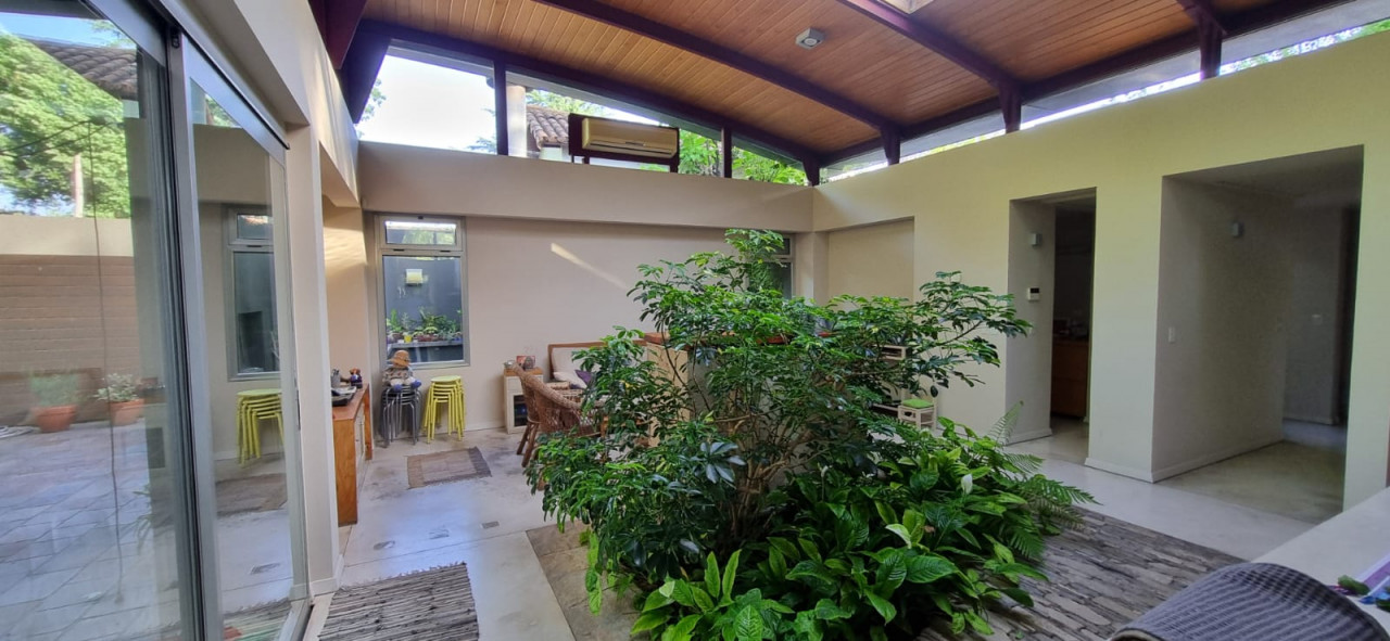 Ingresamos a la propiedad por un jardin arbolado al frente, llegando al living que tiene la posibilidad de pasar al parque del fondo, un ambiente amplio y comodo, con espacio frente al hogar y mesa comedor. Doble circulacion por un lado pasamos al toalet y por el otro, pasamos a la moderna cocina integrada al ambiente con comedor diario frente con ventanal al parque y a continuacion un jardin de invierno interno, que separa de otro espacio, ideal para ver television y leer un buen libro. A mitad del amplio ambiente encontramos un pasillo que distribuye al lavadero que tiene salida al patio lateral, luego a los tres dormitorios, 3 baños y vestidor. En lateral de la casa tenemos estacionamiento para 4 autos, parrilla y espacio previsto para construir piscina. El parque del fondo al igual que cada espacio de la casa, esta pensado y diseñado para ser disfrutado.