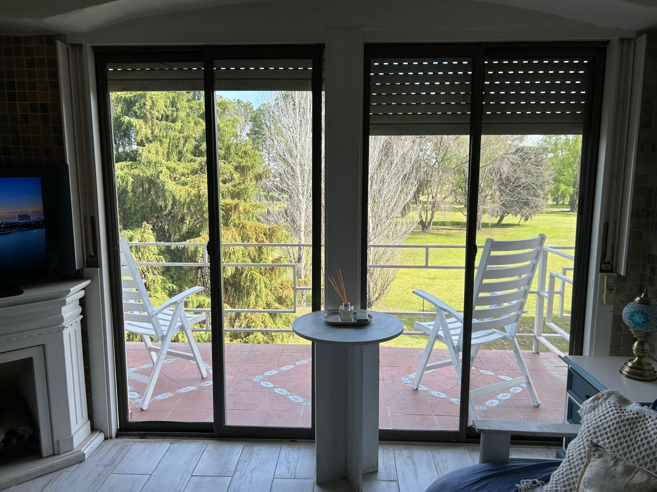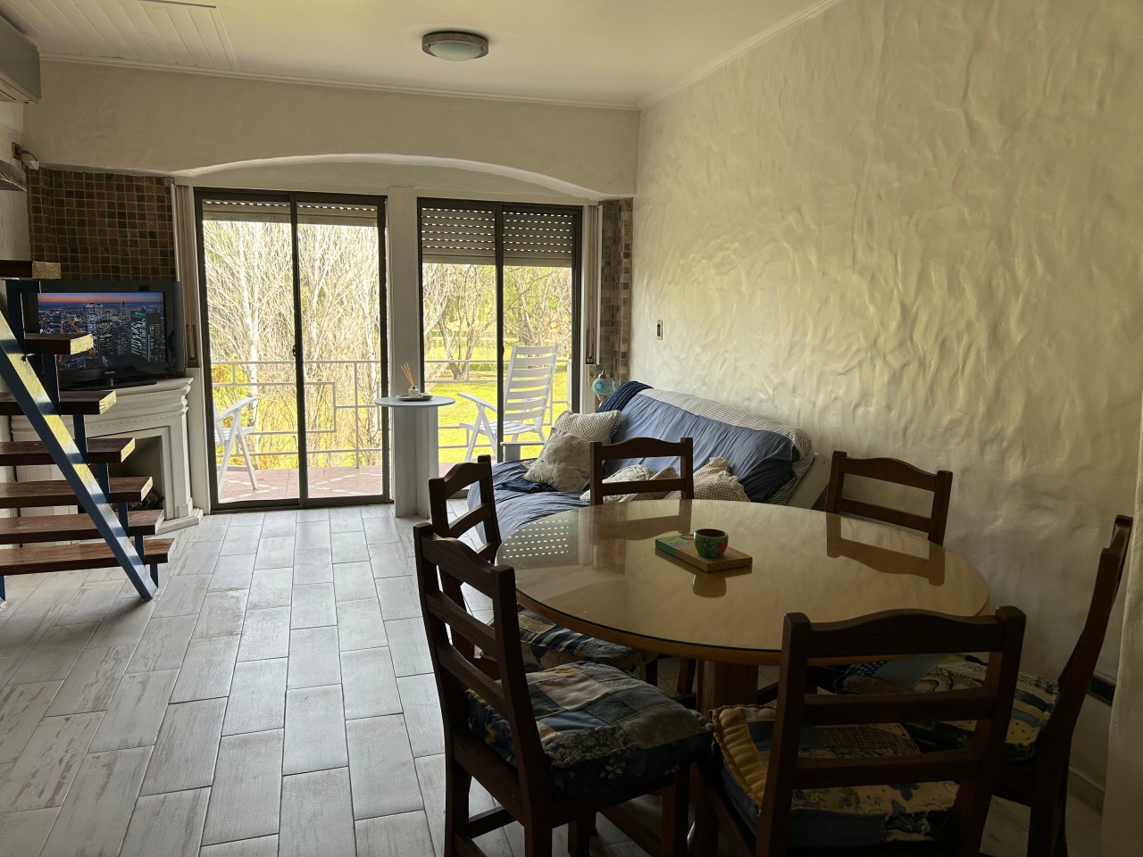 Amplio living comedor con cocina integrada y salida a balcón con vista al golf